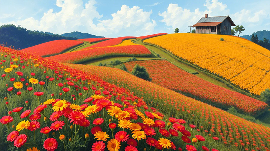 Pemandangan pedesaan Tomohon, Sulawesi Utara, Indonesia, dengan ladang Bunga Krisan yang luas di lereng bukit, sebuah rumah adat Minahasa dari kayu di kejauhan, lukisan cat minyak dengan sapuan kuas tebal (impasto), dalam gaya impresionisme.