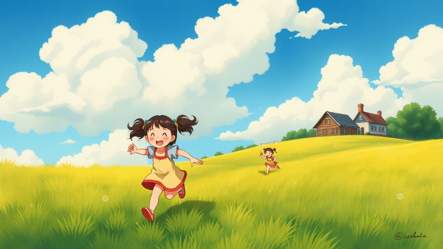Dua anak kecil berlari riang di padang rumput hijau yang subur di bawah langit biru dengan awan cumulus, sebuah rumah pedesaan yang nyaman terlihat di bukit, dalam gaya seni Studio Ghibli yang mempesona, lukisan cat air dan gouache.