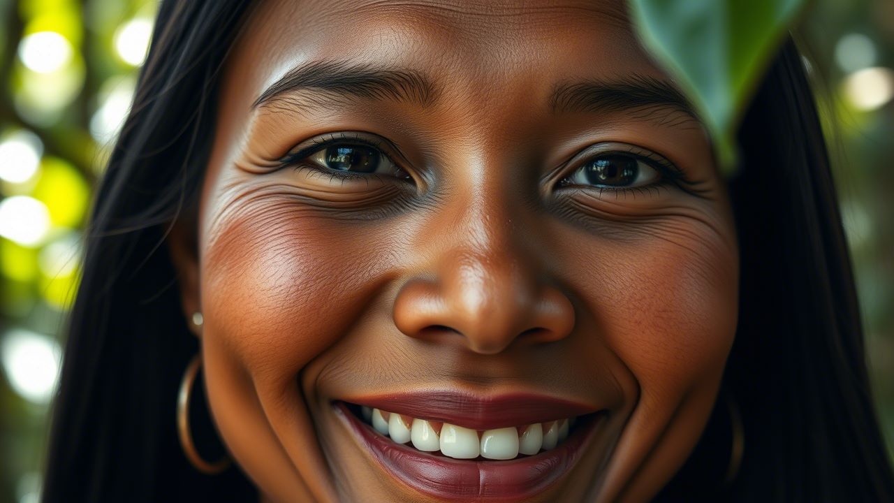 foto potret close-up seorang perempuan muda dan cantik berusia sekitar 30 tahun, dari suku Ambon di Maluku, Indonesia, wajahnya mulus, tidak berkeriput, menampakan keceriaan dan tanpa beban dan tidak menggunakan makeup, tatapan mata yang kecil dan proporsional serta menawan, pencahayaan alami dari celah kanopi hutan, sangat detail, photorealistic, 8K.