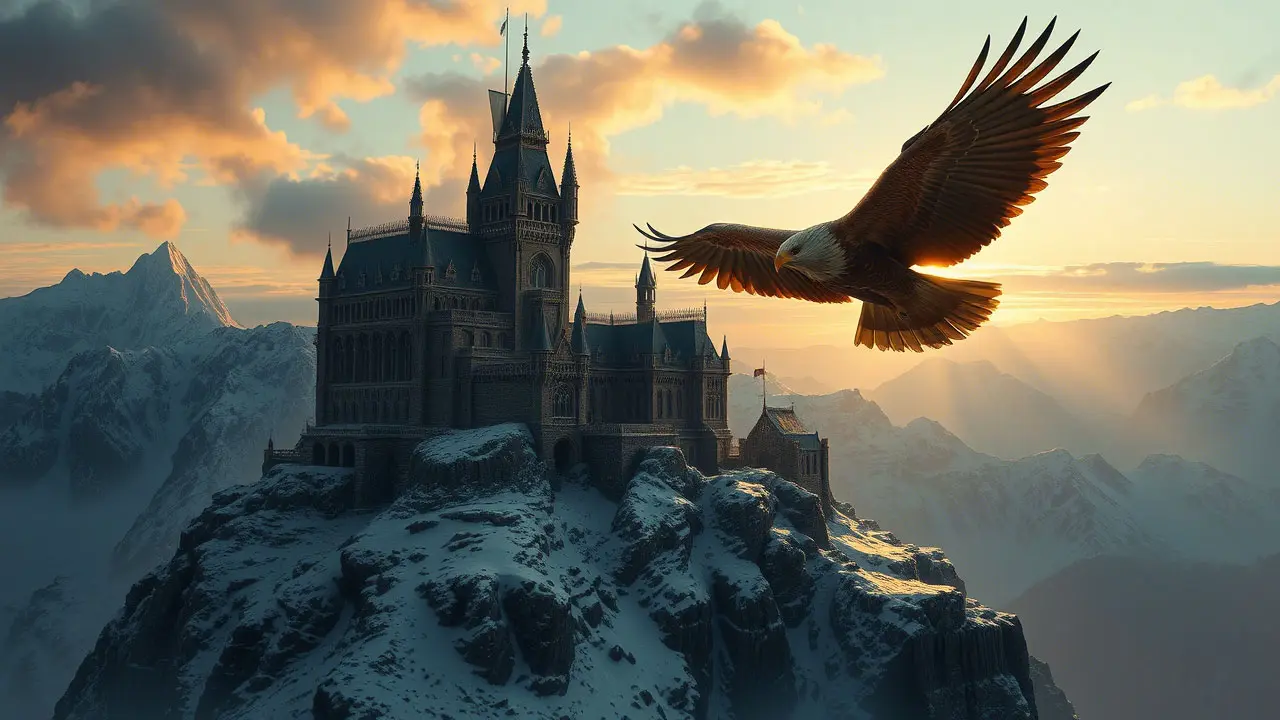 Sebuah kastil gotik megah yang bertengger di puncak gunung bersalju, seekor burung Elang Emas raksasa terbang mengitarinya saat fajar, nuansa fantasi epik, concept art, pencahayaan sinematik, matte painting, highly detailed.