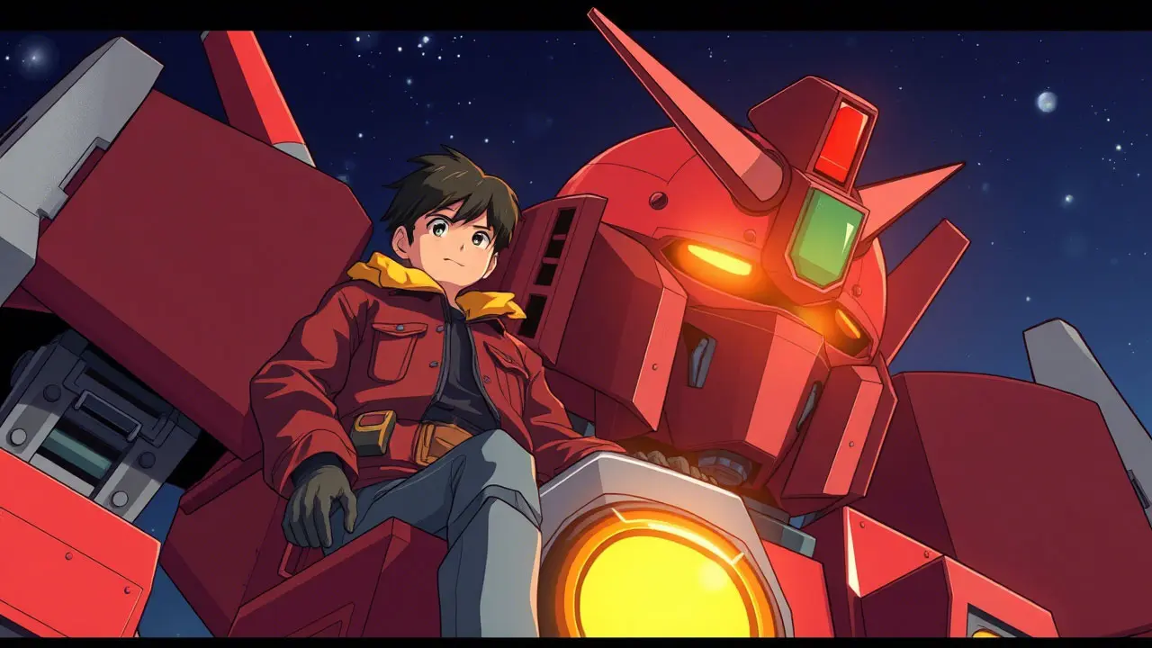 Seorang pilot mecha pria dengan jaket kulit sedang bersandar di robot raksasanya, nuansa senja, gaya anime retro tahun 90-an, cell-shaded, sedikit grain film.