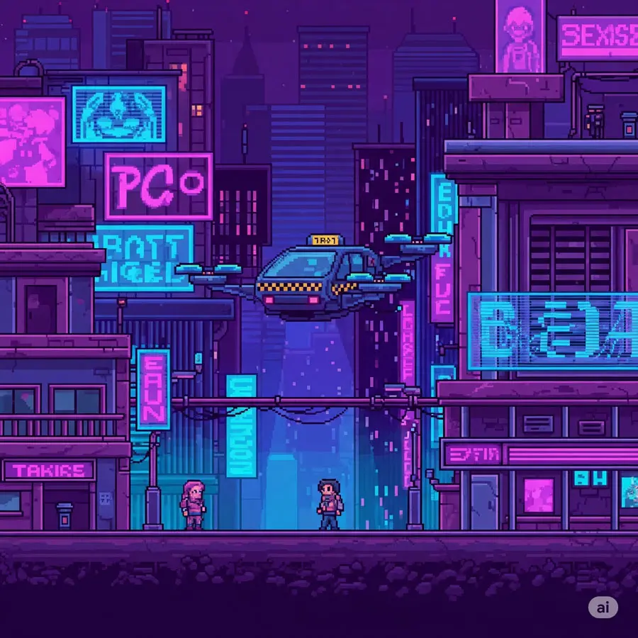 Pemandangan kota di malam hari, drone taksi terbang melintas, 16-bit pixel art, palet warna synthwave (ungu, pink, biru), untuk sebuah game platformer petualangan.